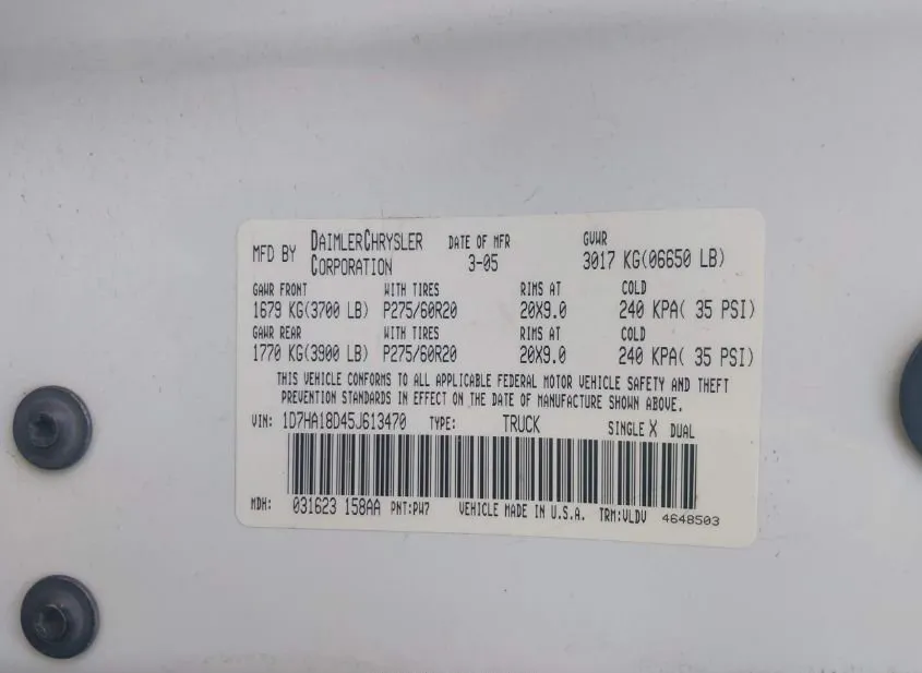 VIN 1D7HA18D45J613470 belongs to a 2005 DODGE RAM. Here you can review the vehicle history, current status, and available condition details.