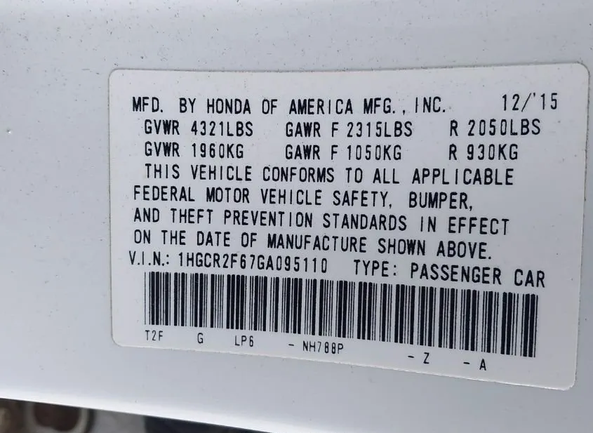 This 2016 HONDA Accord (VIN: 1HGCR2F67GA095110) report indicates no primary damage. Sourced from salvagebid, this data is crucial for assessment.