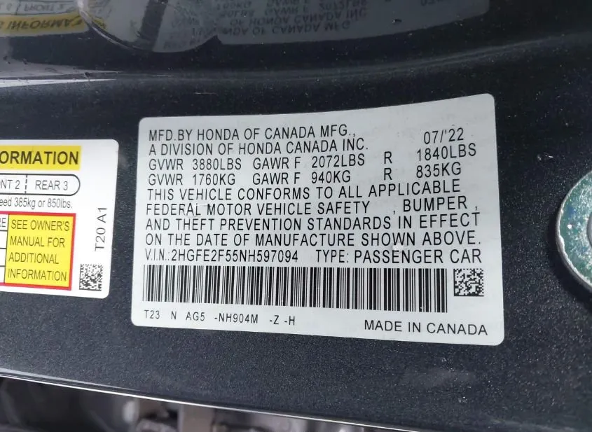 The Vehicle Identification Number (VIN) 2HGFE2F55NH597094 uniquely identifies this specific unit. Each character in the VIN encodes information about the manufacturer, vehicle attributes, and production details. The data below is decoded directly from the VIN and cross-referenced with auction records.