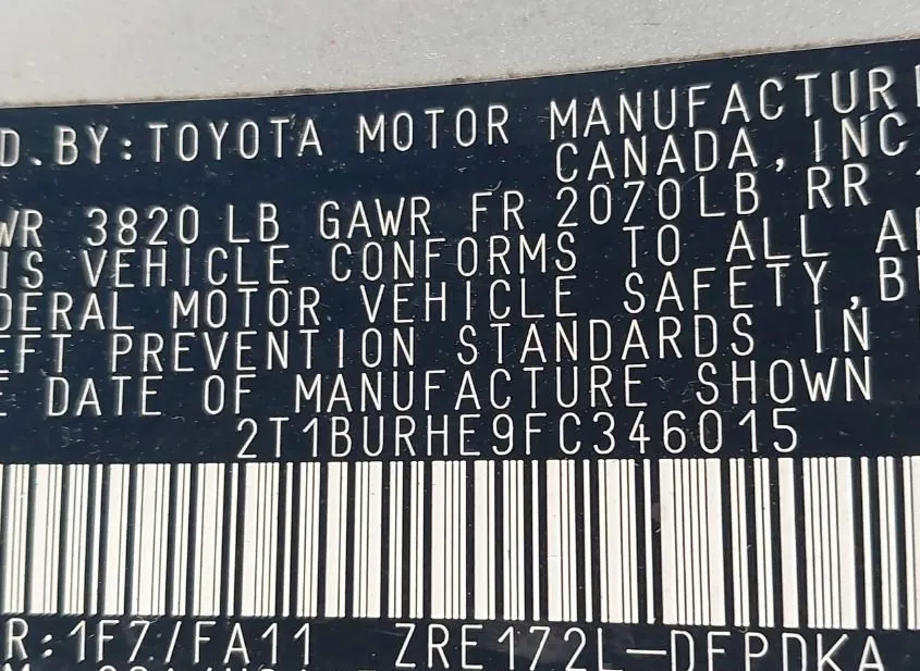 The Vehicle Identification Number (VIN) 2T1BURHE9FC346015 uniquely identifies this specific unit. Each character in the VIN encodes information about the manufacturer, vehicle attributes, and production details. The data below is decoded directly from the VIN and cross-referenced with auction records.