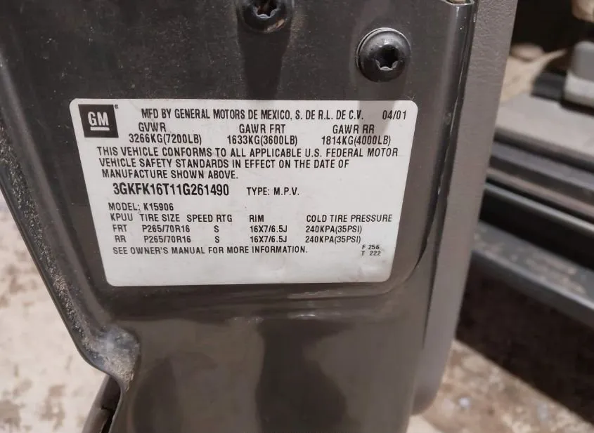 VIN 3GKFK16T11G261490 belongs to a 2001 GMC Yukon XL. Here you can review the vehicle history, current status, and available condition details.