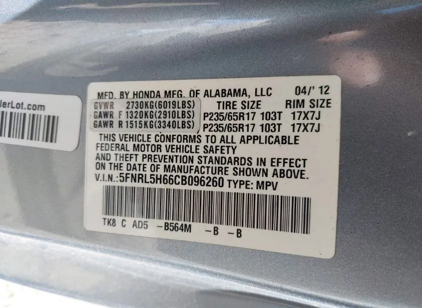 VIN 5FNRL5H66CB096260 belongs to a 2012 HONDA Odyssey. Here you can review the vehicle history, current status, and available condition details.