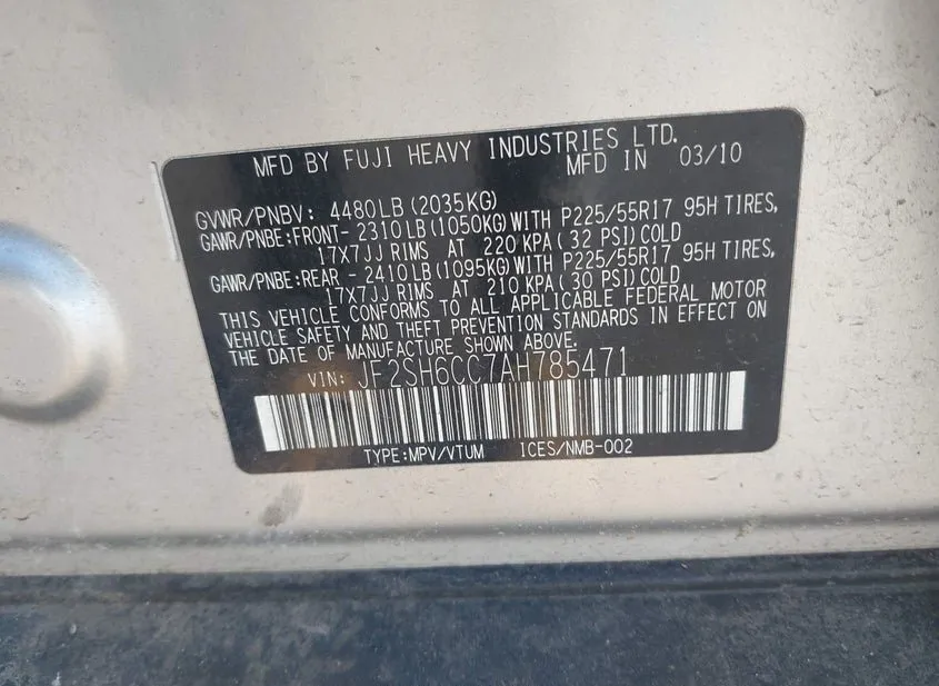The Vehicle Identification Number (VIN) JF2SH6CC7AH785471 uniquely identifies this specific unit. Each character in the VIN encodes information about the manufacturer, vehicle attributes, and production details. The data below is decoded directly from the VIN and cross-referenced with auction records.