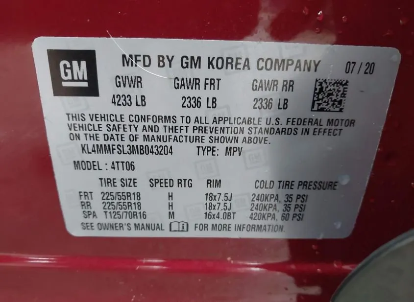 The Vehicle Identification Number (VIN) KL4MMFSL3MB043204 uniquely identifies this specific unit. Each character in the VIN encodes information about the manufacturer, vehicle attributes, and production details. The data below is decoded directly from the VIN and cross-referenced with auction records.