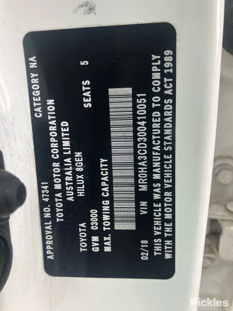 VIN MR0HA3CD300410051 belongs to a 2018 Toyota Hilux. The exterior is finished in White. It is equipped with a Diesel engine and a Automatic transmission. This listing shows the vehicle in used condition. Use this page to review the auction history, current status, and all available condition details before making any purchase decision.