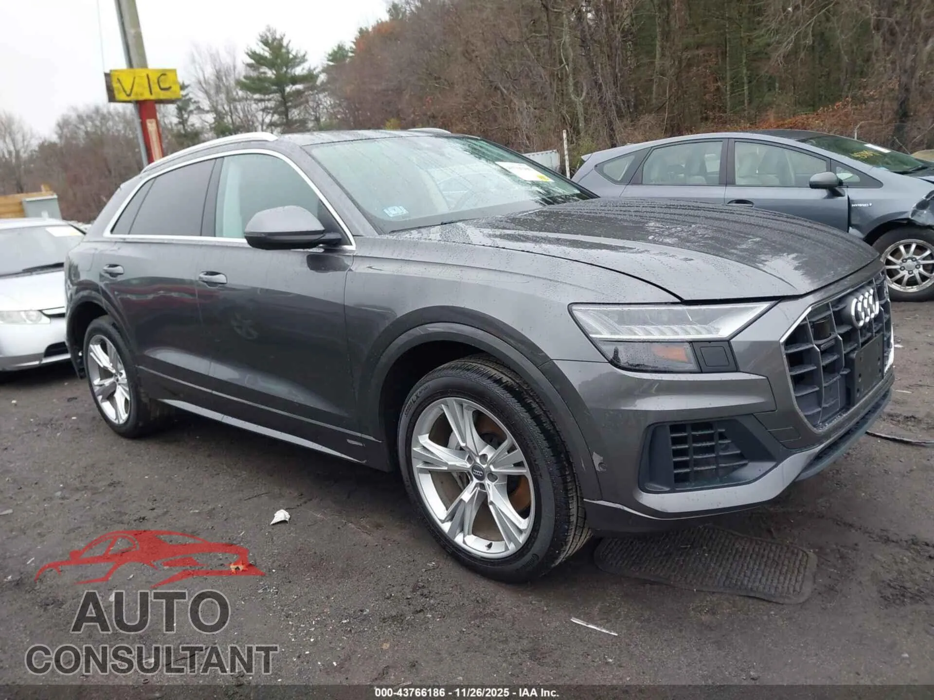 VIN WA1CVAF13LD020156 belongs to a 2020 AUDI Q8. The exterior is finished in Gray. It is equipped with a Gasoline engine and a AUTOMATIC transmission. This listing shows the vehicle in damaged condition with an odometer reading of 91,560 km.