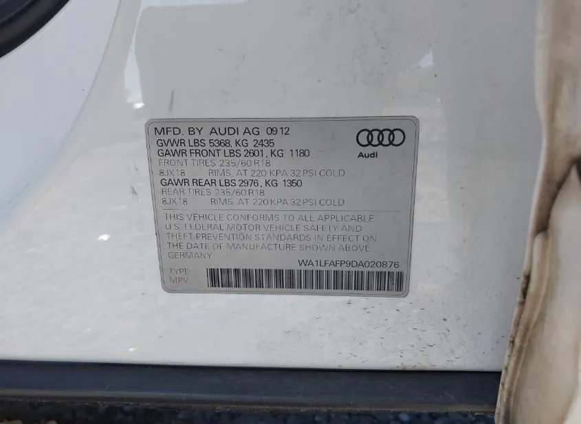This 2013 AUDI Q5 (VIN: WA1LFAFP9DA020876) report indicates no primary damage. Sourced from salvagebid, this data is crucial for assessment.